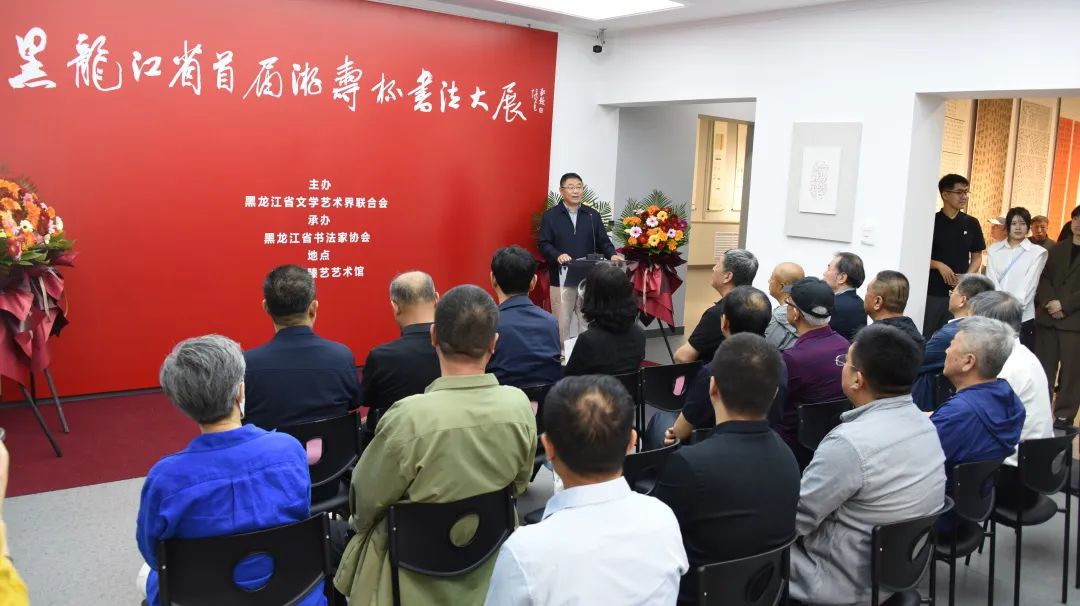 黑龙江省文联副主席、党组成员黄锦秋出席开幕式,开幕式由省书法家协会秘书长秦宏主持。省书法家协会主席张戈致辞并宣布展览开幕。他说,游寿先生是我省书法界的一面旗帜,在国内外具有广泛而深远的影响。本次展览以“游寿杯”命题,体现了我们致敬先贤,向先贤学习的信心和决心,也体现了我们坚定文化自信、传承弘扬中华优秀传统文化的行动自觉。本次展览,也是深入贯彻落实党的二十大精神、学习贯彻习近平总书记在文化传承发展座谈会上重要讲话精神的实际行动。对于打造"龙江书刻″艺术品牌,促进我省书法事业的繁荣发展必将产生深远影响。