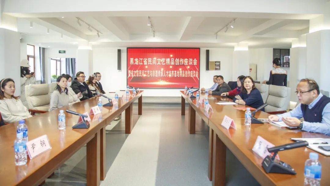 开幕式结束后,黑龙江省民间文艺精品创作座谈会暨省文联民间工艺与非遗传承人才培养基地精品创作座谈会在省文联五楼“臻艺”沙龙召开。来自黑龙江大学、哈尔滨师范大学的专家学者,本次参展作者共同参加,就加强民间文艺精品创作的长远谋划和系统规划、加速创作和人才培养特别是领军人才培养等建言献策。