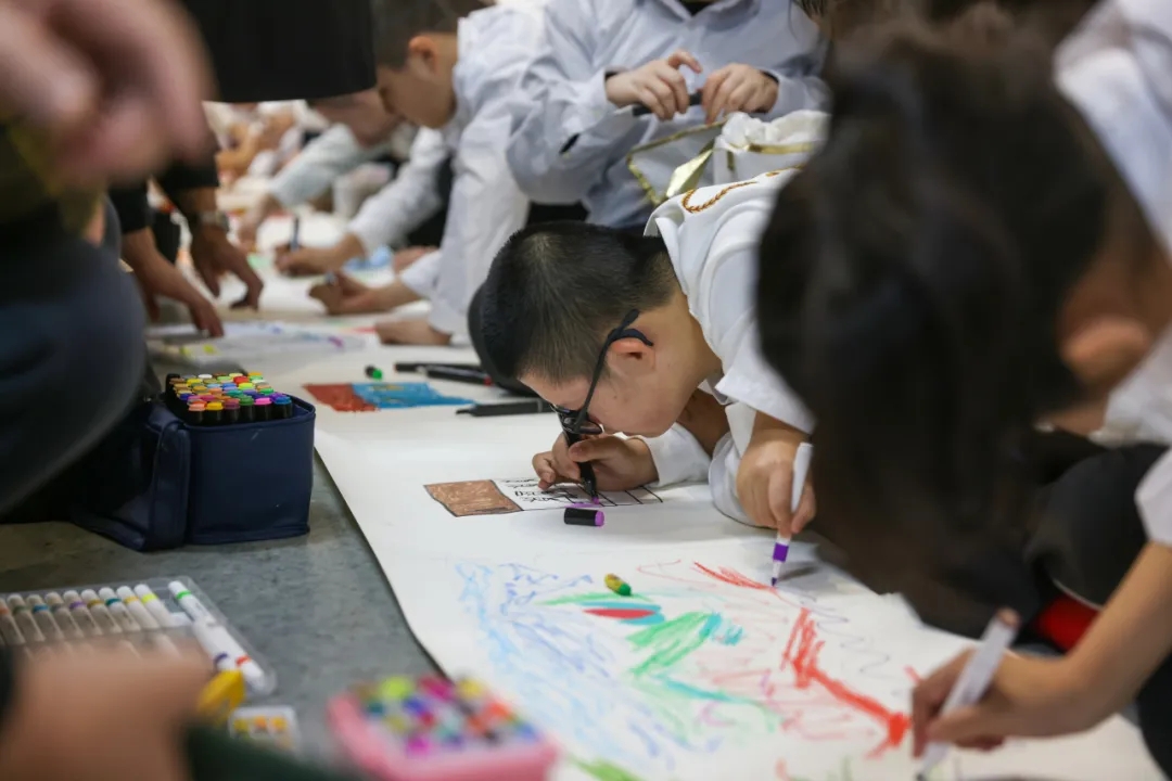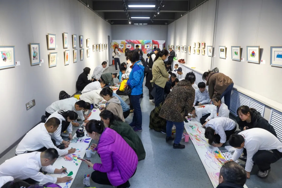 展览分为三个展区,展出“随心涂鸦”精选作品120幅,参展作者是来自“筱齐原生艺术工作室”的40名心智障碍原生艺术家,他们从绘画零基础起步,在一张张白纸上天马行空自发涂画,向外界打开了一扇窗,展现了他们心灵世界的纯净美好。开幕活动中,受邀参展的作者们现场共同创作了一幅长卷作品,用手中的画笔描绘他们眼中的世界、传递他们对生活的热爱。