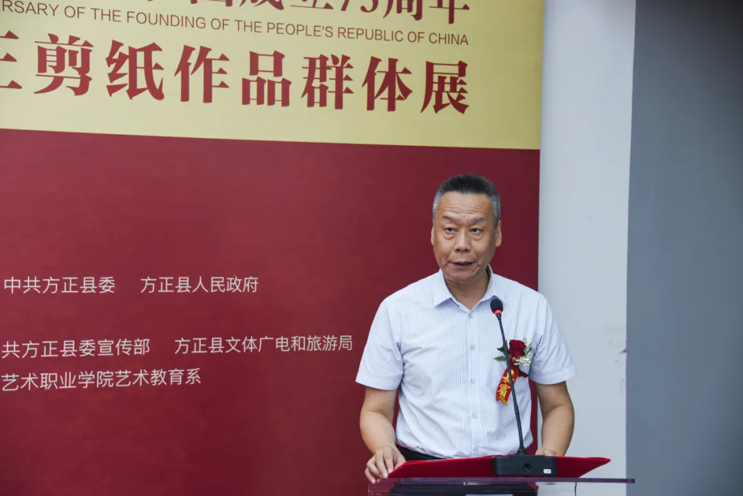 省文联党组书记马新、省文旅厅副厅长于峰、方正县委书记郑伟、黑龙江艺术职业学院党委书记杜伟、方正剪纸作者代表倪秀梅共同为展览剪彩。开幕式由方正县委宣传部部长马延妍主持。省文联副主席、党组成员王广,方正县有关部门负责人及各有关单位代表出席开幕式。