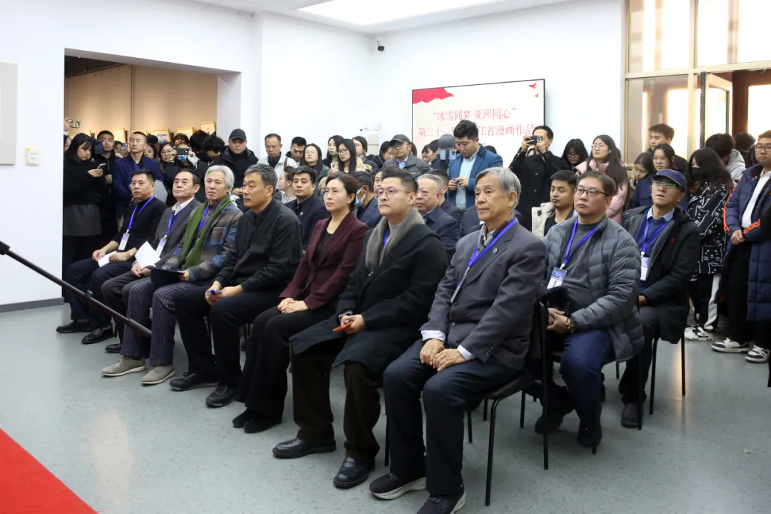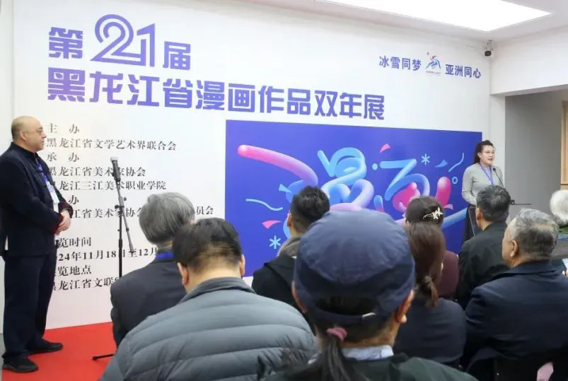 省美协漫画艺委会主任郝延鹏作展览介绍。本届展览以表现龙江冰雪文旅和2025年第九届亚洲冬季运动会为创作主题,展出的119件作品涵盖冰雪旅游、冰雪运动、冰雪产业、冰雪文化、冰雪风情、冰雪生活等题材,旨在全面践行“冰天雪地也是金山银山”的发展理念,进一步擦亮哈尔滨“冰雪文化之都”城市名片,深入展现龙江冰雪魅力和冰雪风采。