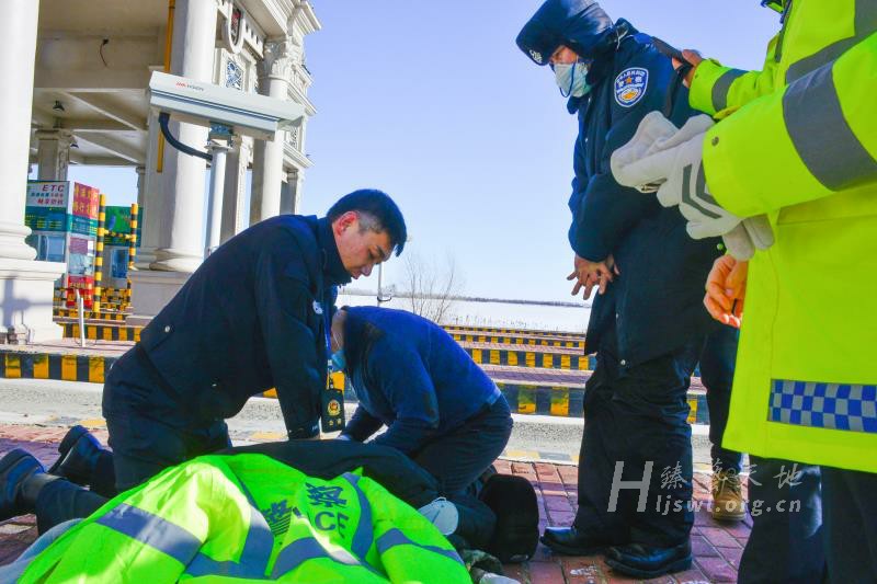 2月14日,公安交警王志坚在高速卡点执勤中为因突发疾病倒下的志愿者做心肺复苏中抢救时的情景。