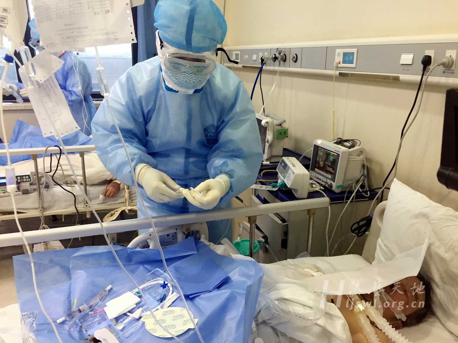 武汉第一医院隔离区内,黑龙江的医疗队队员正在为一名使用有创呼吸机的患者换药。