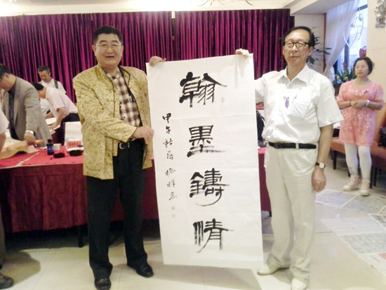 展览过后举办了两地书画家笔会。笔会现场,贾振祥挥毫写下“翰墨铸情”赠给台北中华书画艺术学会,同时该会笫七届理事长锺仲威向贾振祥颁发了艺术顾问聘书。