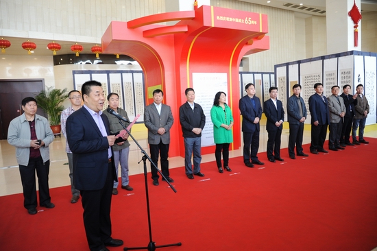 丹江抒心韵,龙山翰墨缘。正值中共中央总书记、国家主席、中央军委主席习近平在北京主持召开文艺工作座谈会并发表重要讲话之际, 10月18日由牡丹江市书协、北京市房山区书协共同主办的“翰墨圆梦颂中华” 黑龙江省牡丹江市-北京房山区两地书法联展在北京房山区隆重举办,以书法艺术的形式庆祝中华人民共和国成立65周年,是牡丹江市书法界对外交流的一件大事。北京市房山区人大常委会主任、燕山工委书记史全富、房山区文联副主席刘月辉、燕山工委副书记樊宗军、燕山办事处副主任王大利、房山区书法美术家协会主席侯振海、燕山工委委员、宣传部长于勇、牡丹江市文联副主席禇保军、牡丹江市书法家协会主席韩润森、北京、牡丹江两地书法家协会的副主席、秘书长及书法爱好者近400人参加了开幕式。