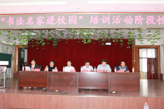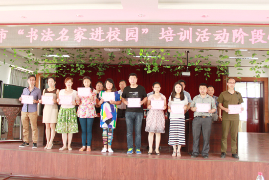 “书法名家进校园活动”是贯彻落实《国家中长期语言文字事业改革和发展规划纲要(2012-2020年)》和《国家语委、中国书法家协会关于开展“书法名家进校园”活动的通知》文件精神的一项重要举措,更是繁荣书法艺术创作和书法教育事业,推进“深入生活、扎根人民”,“结对子、种文化”主题实践活动深入开展的一个实际行动。从去年9月开始,活动到目前为止历时一年,现场培训12次,网络教学近10次,培训全市中、小学师生近2000人次,取得了阶段性的成果。由牡丹江市书协选派的主讲教师张东昌在培训过程中从欧体入手到行草书的转化与衔接,精心安排书法课程讲座,进行现场示范指导、从对古帖的临习到书法作品的创作理念、形式等都为参训的师生们进行了细致的讲解与沟通。通过一年的培训,很多参训的教师在书法临习和创作上都有了很大的提高。通过对学员的评比最终在参训的教师中评选出10名优秀学员。牡丹江市语言文字工作委员会办公室主任刘文生宣读优秀学员名单。牡丹江市文联主席冯红、市教育局副局长吕文涛、市书协主席韩润森、市语言文字工作委员会办公室主任刘文生、市书协副主席张东昌为优秀学员颁发证书。书法名家进校园活动在弘扬我国优良文化传统,营造全市中、小学师生热爱国粹艺术的氛围上起到了重要的作用,希望在下一期的培训中能取得更加丰硕的成果。