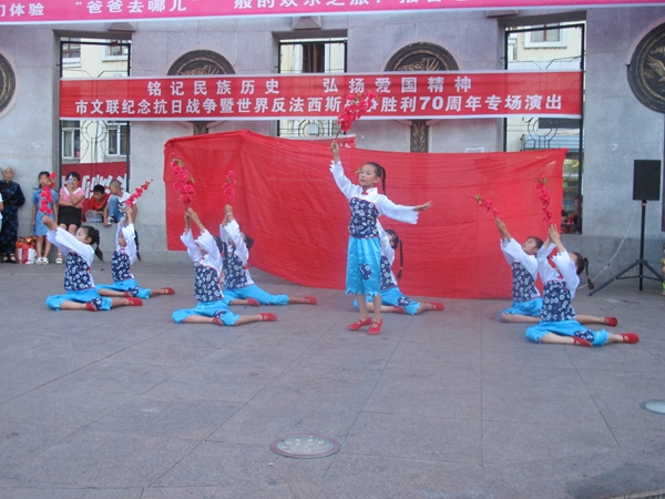 8月20日,由五大连池市文联举办的纪念抗日战争暨世界反法西斯战争胜利70周年文艺演出在文化广场举行。来自五大连池市的民间音乐戏剧家协会、音乐家协会、舞蹈家协会艺术家们纷纷登台献艺,倾情奉献了歌剧白毛女选段《扎红头绳》、舞蹈《卢沟瑶》等精彩节目,博得现场群众的热烈掌声。