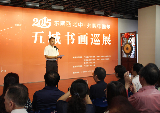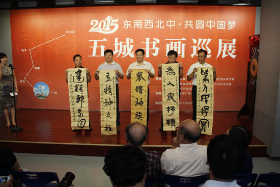 在牡丹江市文联和包头市文联的倡议下,五城市文联选取书画交流这个基点,搭建文化交流的平台,通过书画创作的形式,扎扎实实的将《繁荣发展社会主义文艺的意见》落在实处。开幕式上五城市的文联领导展示了来自五个城市的书法家分别用篆、隶、楷、行、草五种书体书写的“为人民抒写、为人民抒情、举精神旗帜、立精神支柱、建精神家园”五幅书法作品,表达了五城文艺界以人民为中心的创作导向和为人民抒写、为人民抒情的艺术情怀。广州市文联主席李鹏程致辞,热烈欢迎五城市文联及书画界的同仁齐聚广州,特别是在中共中央刚刚审议通过重要精神的时候,彰显了文艺界紧随时代,共圆中国梦艺术使命感,希望将展览打造成品牌活动,更进一步的促进五城市之间的交流与合作。牡丹江市文联党组书记、主席冯红代表四城市讲话,他指出:“民之魂,以文化之;国之魂,以文铸之”,文化是一座城市的灵魂和生生不息的动力,是一座城市经济社会可持续发展的有力支撑。推进城市文化繁荣发展、促进城市之间文化交流,是五城市的共同心愿。笔墨当随时代,相信在五城文联的共同努力下,书画巡展一定会精彩地呈现到五城市,促进五城市文艺事业的共同繁荣和发展。
