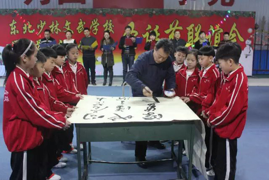 12月26日下午,伴随着冬日里温暖的阳光,牡丹江市书协甲骨文学会、东北少林文武学校隆重举行了一场别开生面的迎新年联欢会。这一天也是伟大领袖毛主席诞辰122周年。牡丹江市文联主席冯红、副主席褚保军、牡丹江市书协主席韩润森、副主席佟冬人、秘书长李丹及市书协甲骨文学会的领导和书法家们来到活动现场,与东北少林文武学校的同学们共同联欢。