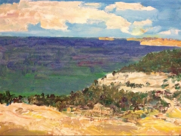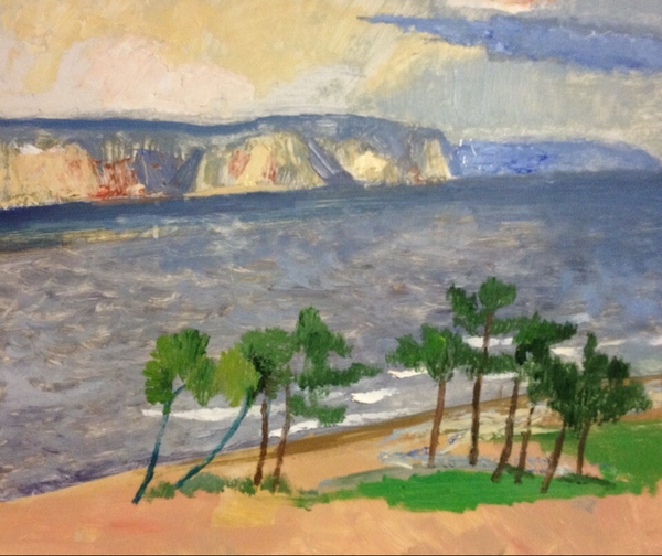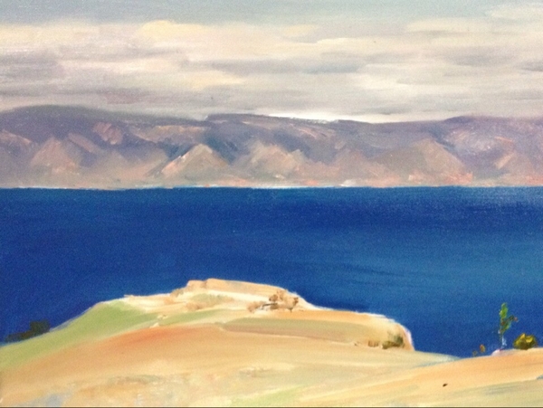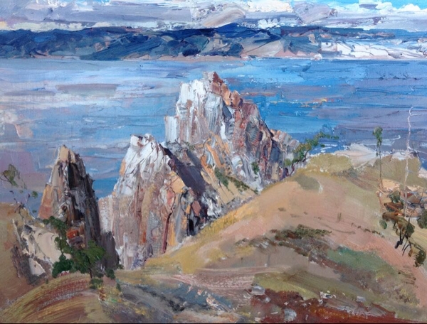 清晨的霞光,黄昏的落日,或风和日丽,或阴雨沉沉。贝加尔湖特有的、比蓝玻璃还蓝的清澈湖水随着光与风的变化而变幻莫测。还有雄壮的山峦,陡峭的悬崖,舒缓起伏的丘陵,低沉翻卷的云朵,都给画家提供了丰富多样的可绘之景。虽然有呼啸的山风把画布吹得抖动不停,但广袤丰厚的植被、明净清澈的湖水以及那完全没有蚊虫叮咬的生态环境还是让画家们感到十分的激动和兴奋。