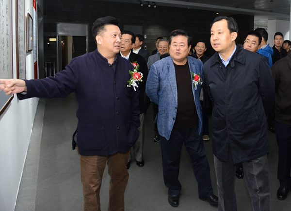 著名歌手郁钧剑(左)、著名音乐家徐沛东(中)和黑龙江省省长陆昊(右)一起参观书画展