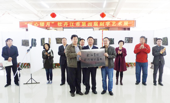 为庆祝建国65周年,弘扬书刻艺术、发展“龙江书刻”,努力创作书刻艺术精品,由黑龙江省书协、牡丹江市文联、牡丹江市书协联合主办,牡丹江市刻字专业委员会、黑龙江省幼儿高等师范专科学校承办的“龙江书刻”创作基地授牌仪式暨“匠心镂月”——牡丹江市第四届刻字艺术展于10月10日在黑龙江幼儿师范高等专科学校举行开幕式。省文联党组成员、副主席、省书协常务副主席兼秘书长张戈,牡丹江市委常委、宣传部长闫岩,牡丹江市文联主席冯红、副主席褚保军,黑龙江幼儿师范高等专科学校党委副书记郭洪涛、工会主席夏莹,牡丹江市书协名誉主席刘国仲、顾问孟飞、主席韩润森等领导、专家以及市书协主席团成员、创作骨干和黑龙江幼儿师范高等专科学校师生300余人出席了开幕式。