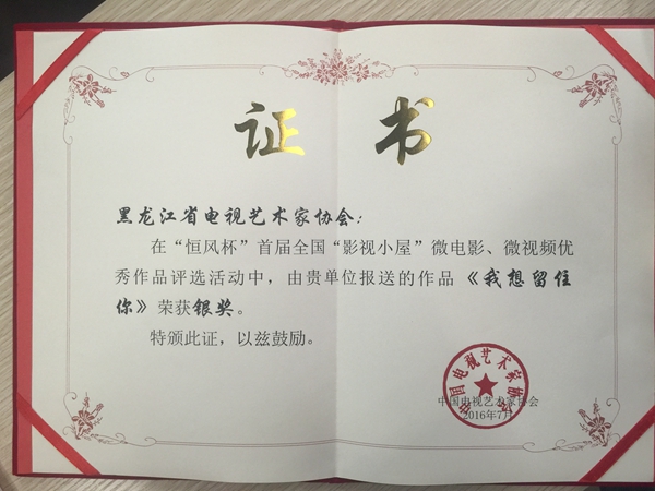7月28日,由中国电视艺术家协会、四川省文联主办的“恒风杯”首届全国“影视小屋”题材微电影颁奖活动在成都市举办,我省作品《我想留住你》获得银奖。