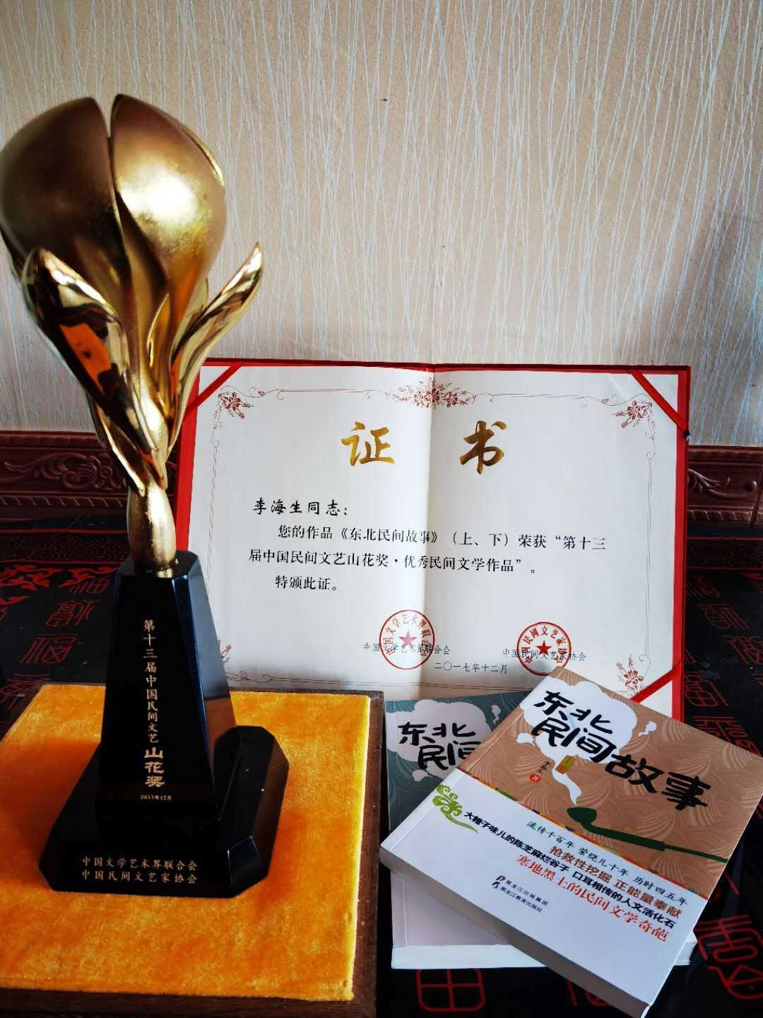 作品获奖情况:2017年12月获得第十三届中国民间文艺山花奖,2018年10月获得第十届黑龙江省文艺奖一等奖,2019年4月被新闻出版总署列入2019年度农家书屋推荐书目。该书出版后,连续参加23、24两届北京国际图书博览会;连续两届参加上海书展和哈尔滨图书馆馆配图书展;2016年被黑龙江教育出版社评为50种优秀图书;2016年9月8日天津日报以《听太奶们讲寒地黑土上的传说》进行专访;2016年10月10日广州日报以《大碴子味的陈芝麻烂谷子故事》进行报道;2016年对话《东北民间故事》李海生:文学的魅力在于大俗就是大雅。