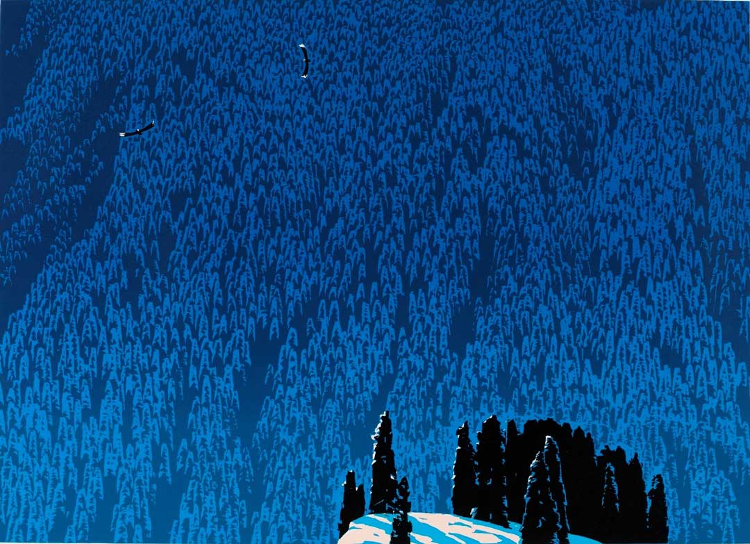 晁楣,《松谷》,版画(套色木刻),60cm×83cm,1984年,获第六届全国美展金奖,曾在美国、英国、法国、德国等60余个国家巡回展出,曾被中国美术馆等10余家国内艺术机构收藏,曾被英国木板协会、牛津大学博物馆、美国密西根州州立博物馆、日本神奈川现代美术馆及台北市立美术馆、香港大学冯平山博物馆、澳门贾梅士博物院收藏。