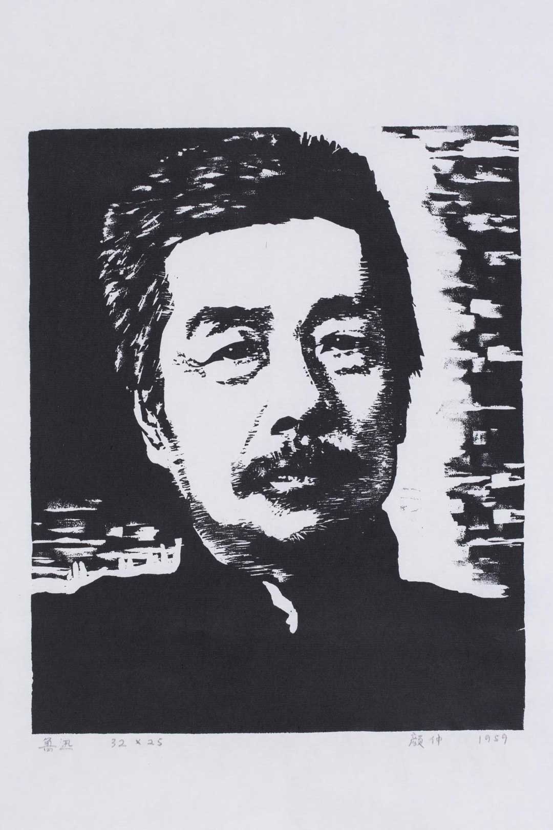 颜仲,《鲁迅》,版画,32cm×25cm,1959年,鲁迅诞辰一百周年大会开幕式当天,《鲁迅》被放大100倍悬挂在人民大会堂主席台上方。曾入选第四届全国版展,参加全国美展对外文委出国展,以及“纪念毛泽东《在延安文艺座谈会上的讲话》三十五周年”举办的全国美展。