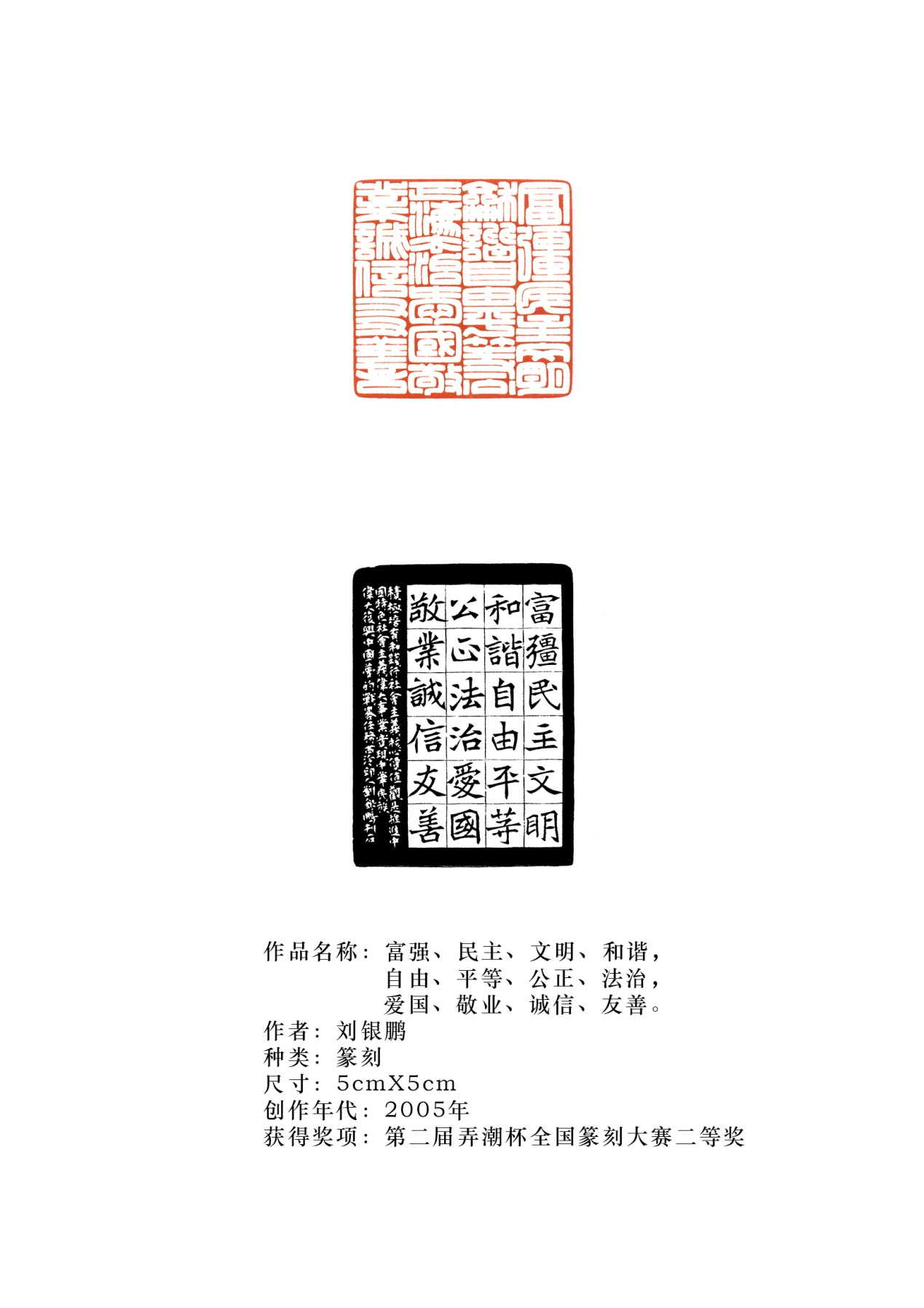 刘银鹏,男,1969年3月生于黑龙江省双鸭山市。九三学社社员,国家一级美术师。毕业于哈尔滨师范大学美术教育系美术学专业,本科、学士学位。2003年被市委、市政府授予“哈尔滨市有突出贡献中青年专家”,2008年被省委、省政府授予“黑龙江省优秀中青年专家”。现为哈尔滨老年人大学教务处副处长兼书法系主任,书法专业学科带头人。刘银鹏从事书法篆刻艺术的研究创作36年,从事书法、篆刻教学工作24年,在专业创作上取得了较高的艺术成果,在全国文化艺术界享有较高声誉,被誉为中国篆刻界“工整印风”的代表人物之一,被文化部授予“世界华人艺术家”荣誉称号,“国家艺术基金”培养的全国中青年篆刻人才。现为中国书法家协会会员,西泠印社社员,黑龙江省书协理事,哈尔滨市书法家协会副主席、篆刻家协会主席,并多次担任全国篆刻大赛及黑龙江省篆刻大赛评委。是黑龙江作者在中国书协主办的全国书法篆刻大展及西泠印社大展中篆刻作品获奖第一人,为此受到省书法家协会的“特别嘉奖”并被授予“黑龙江省篆刻事业杰出成就奖”。