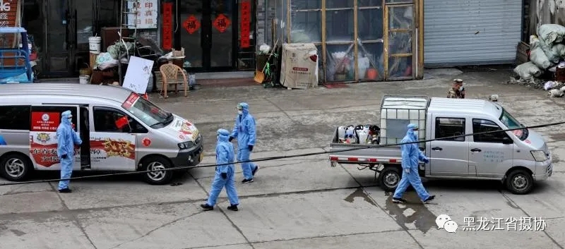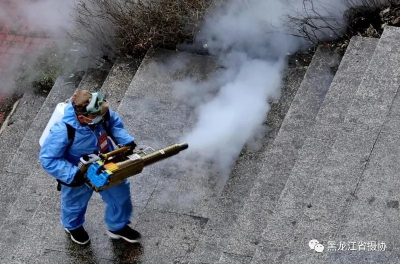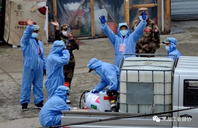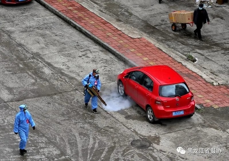 驰援武汉归来的志愿者们,又疾驰绥芬河,在绥芬河迎泽丽都小区,为小区进行消杀。
