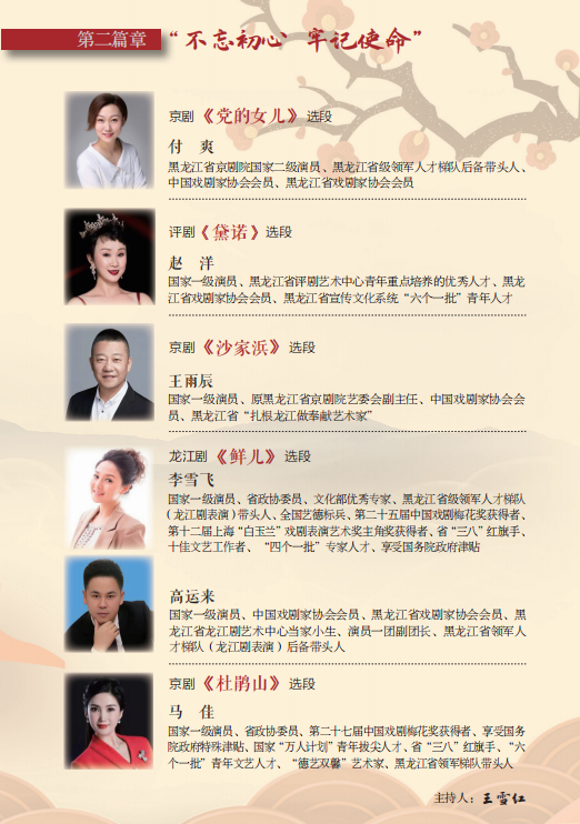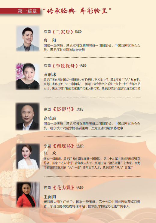 为庆祝中国共产党成立100周年,坚定文化自信,弘扬民族精神,传承民族文化,用经典戏曲传承时代梦想,丰富广大人民群众精神文化生活,为建党百年华诞营造浓厚氛围。黑龙江省戏剧家协会、黑龙江省图书馆联合主办“致敬经典 礼赞百年——庆祝中国共产党成立100周年黑龙江戏曲名家演唱会”。特邀龙江戏曲名家、“梅花奖”得主王向阳、李雪飞、马佳、张欢等艺术家联袂登台,强劲的阵容、经典的唱段,再现传统文化之美,弘扬主旋律,传播正能量,与您共赏一场精妙绝伦、群星荟萃的戏曲文化盛宴。