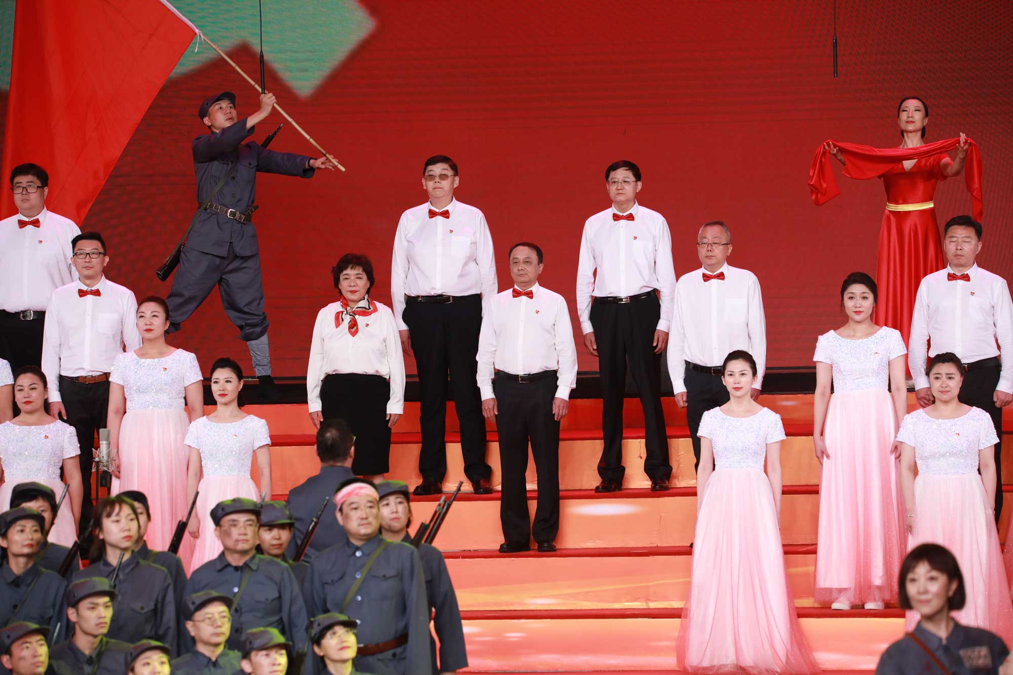 参加省文联《永远的旗帜》演出,担任领唱深感荣耀。每次彩排在后台等待上场时都被舞蹈演员演绎的悲壮场景深深地打动,她们为了国家和人民抛头颅洒热血、不畏艰难困苦、不怕流血牺牲的伟大精神深深地震撼了所有参演人员的心。我看到演员们非常的投入,每次排练都拿出最饱满的热情, 深深地沉浸在所饰演的角色中。让我用歌声尽情地表达对革命先烈最崇高的敬礼,用歌声祝福我们伟大的中国共产党生日快乐!祝愿我们伟大的祖国更加繁荣富强!