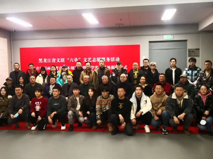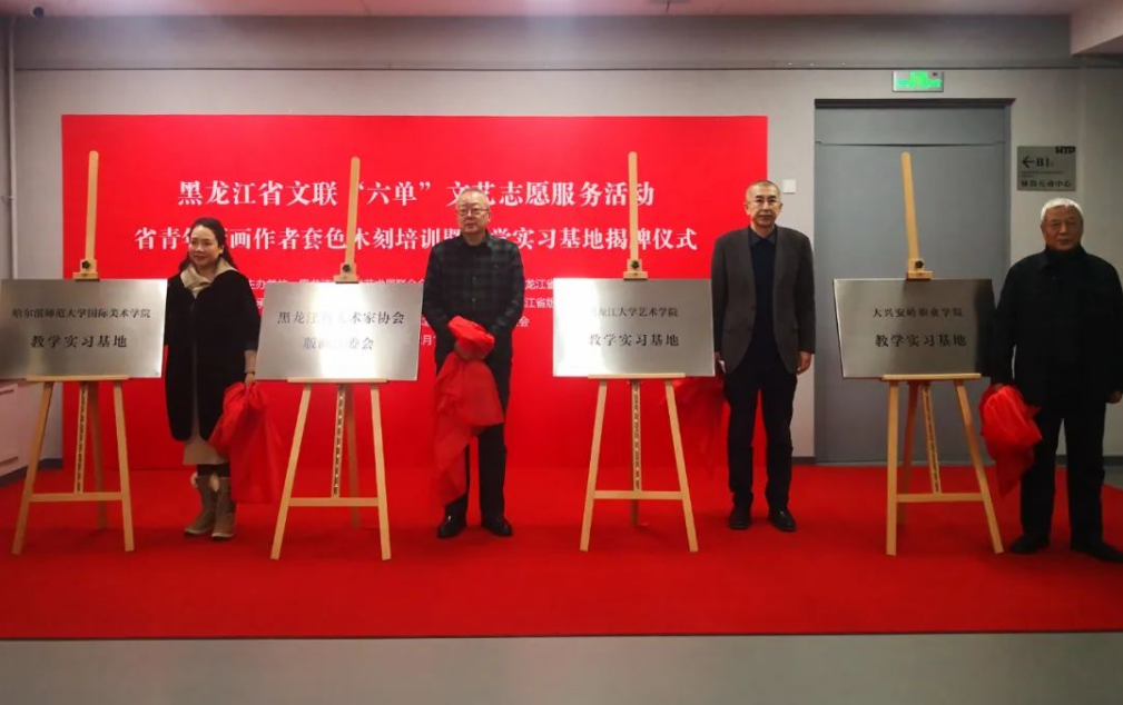 黑龙江省文学艺术界联合会主席韩会峰(左二)为黑龙江(国际)版画博物馆的高校教学实习基地揭牌