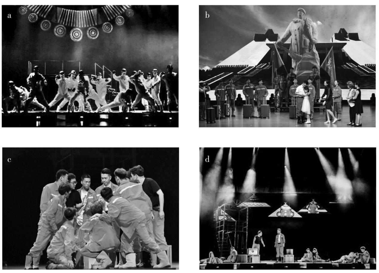 《铁》剧的主要场景为国内与苏丹两部分,戏剧的开篇便通过倒叙的手法,将国内临行前温情的戏剧情境穿插在两段有关苏丹的戏剧情境之中,凸显苏丹环境的艰苦与恶劣。前部分苏丹场面,即开篇序幕《逐梦苏丹》中,通过合唱、群舞的方式交代环境与背景——隆隆的钻机声、狂风漫卷黄沙的声音,群舞演员还原了石油工人烈日风沙中的劳动场景,配合全黑舞台上频闪或杂乱游移的定点光营造出一种极其紧张、危险、急促的氛围(图1-d)。后部分,即第二场《初到苏丹》,猩红色定点光暗喻了恶劣的自然环境(图1-b),人物着石油工人服装作定点造型。直至四分钟后,该场景才由红转为正常暖黄色,并增加人物面光,给人以炎热、压迫的视觉感受(图1-c)。前后苏丹情境,与国内分别场面(图1-d)形成强烈视听差异,在“强—弱—强”中交代故事背景,形成戏剧的语言符号,深化戏剧的叙事性。