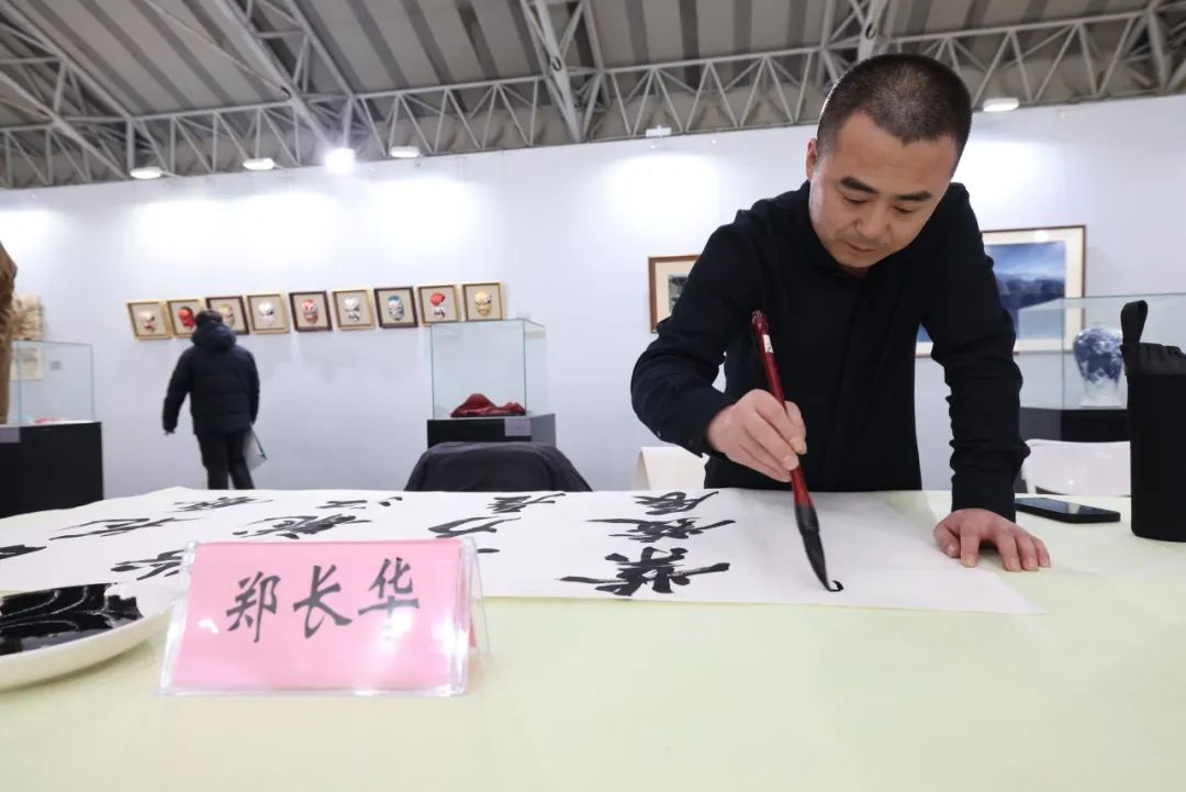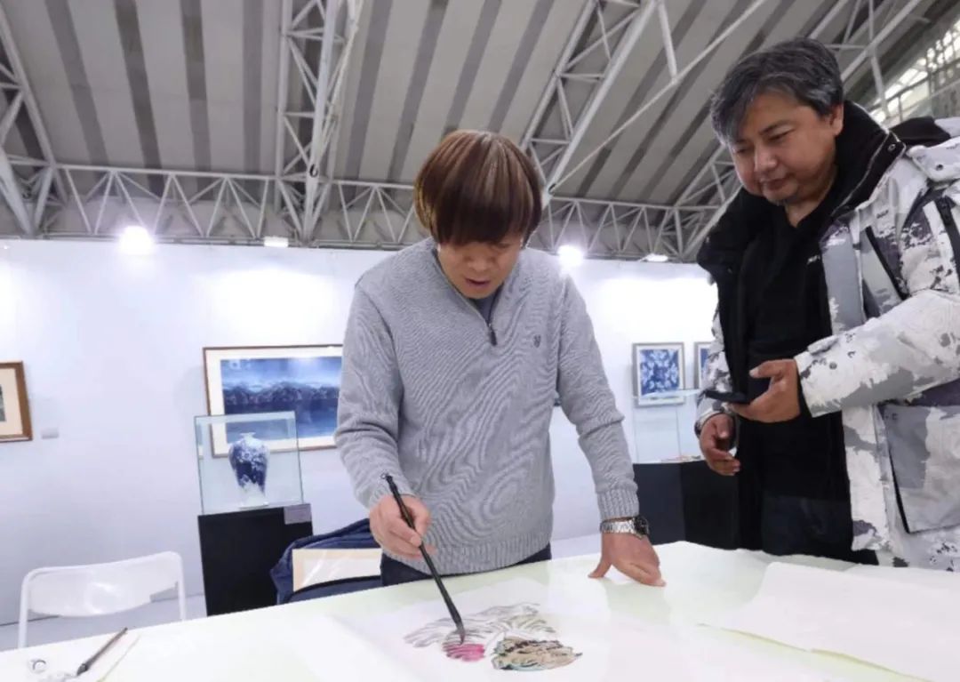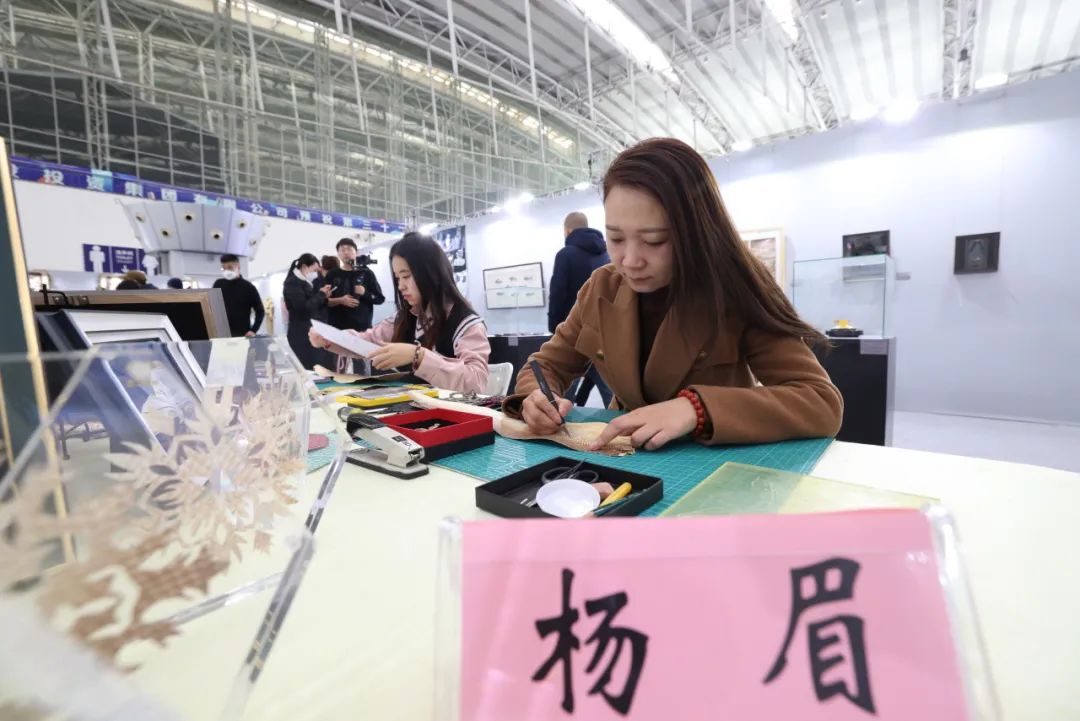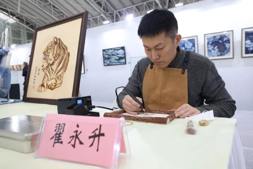 12月2日,在展会现场,孙作范、杨眉、郭蓝蓝、郑长华、翟永升、王丽彦等艺术家还以“魅力龙江·创意赋能”为主题进行现场示范创作,让观展者零距离感受书法、漫像、剪纸、烙画、扎染、鱼皮画等艺术门类创作过程。一位来自南方的客商李先生兴奋地说:“黑龙江的工艺美术有传统,有特点,很美,艺术家的创作水平也很高,让我大饱眼福,很多作品都具有产业化市场化潜力。”