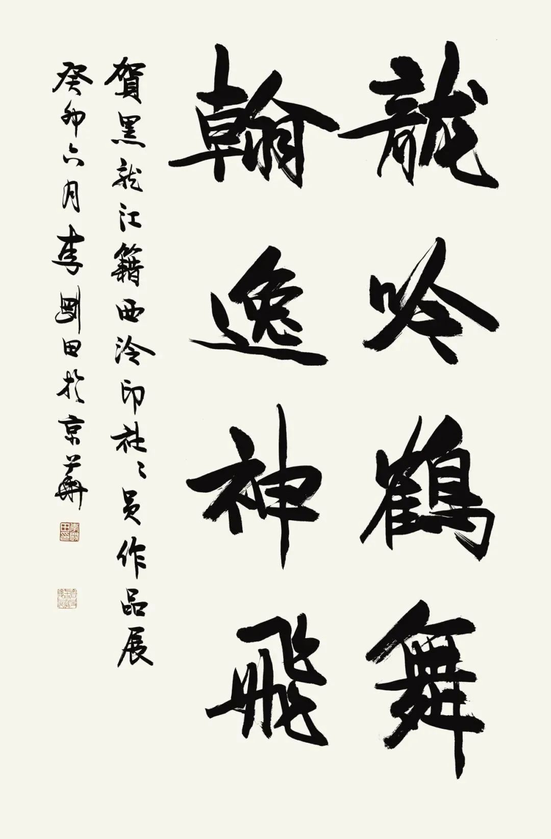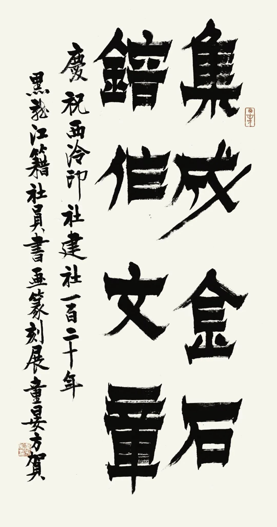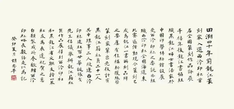 展览结束后,由张戈题引首“龙吟鹤舞”、胡志平和陈国成作尾跋,黑龙江老、中、青三代社员10人集体创作的书法篆刻作品手卷和社员杜延平、芦海娇、金恩楠、张学斌、汤忠辉、陈国成、沈沉、哈普都·隽明创作的8方印章,以及贾振祥老师的书法及印屏各一件,将全部捐赠给西泠印社。