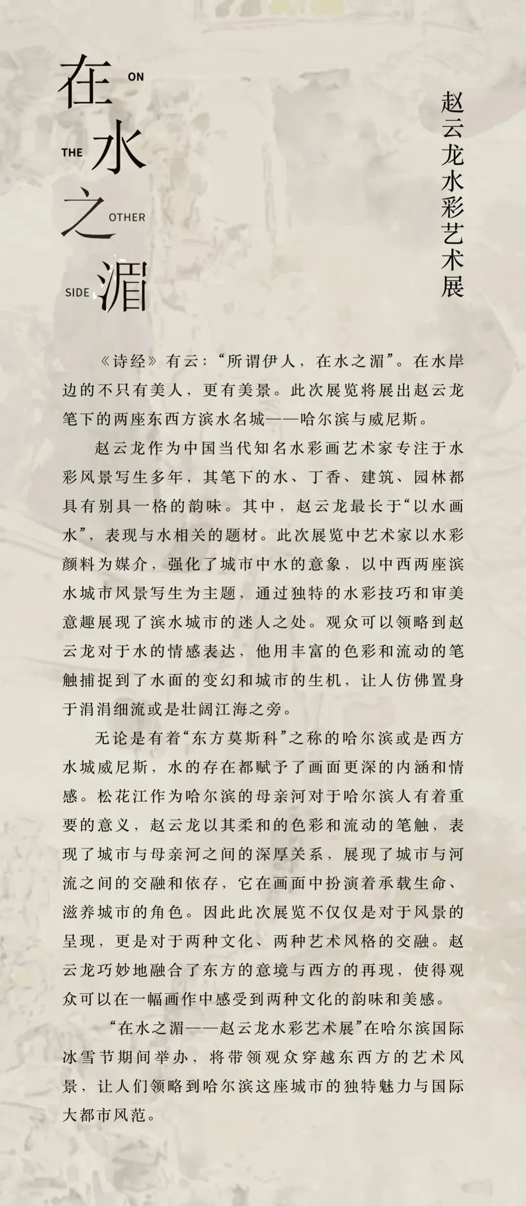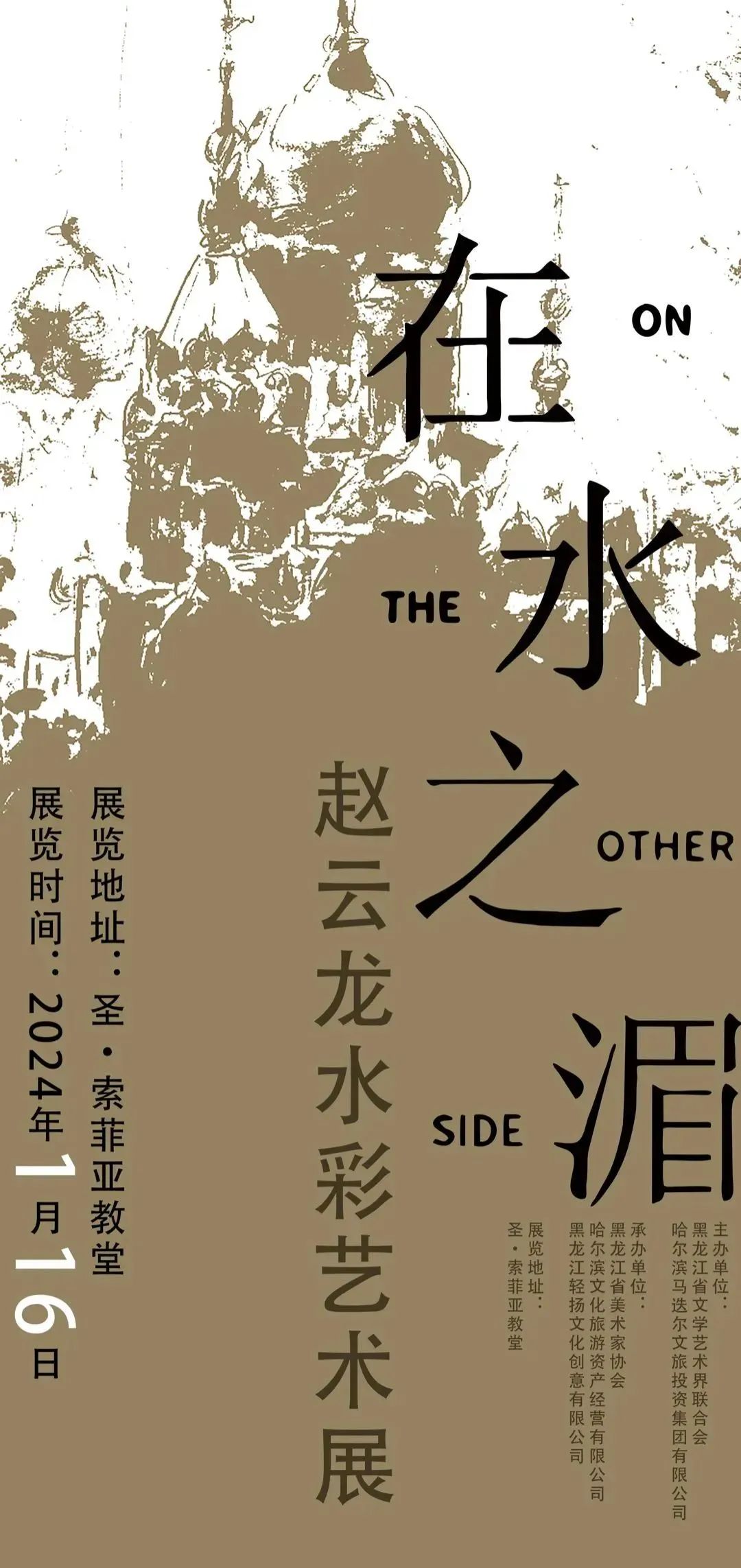 由黑龙江省文学艺术界联合会、哈尔滨马迭尔文旅投资集团有限公司主办的,黑龙江省美术家协会、哈尔滨文化旅游资产经营有限公司、黑龙江轻扬文化创意有限公司承办的《在水之湄——赵云龙水彩艺术展》于1月16日至2月16日在索菲亚大教堂展出。