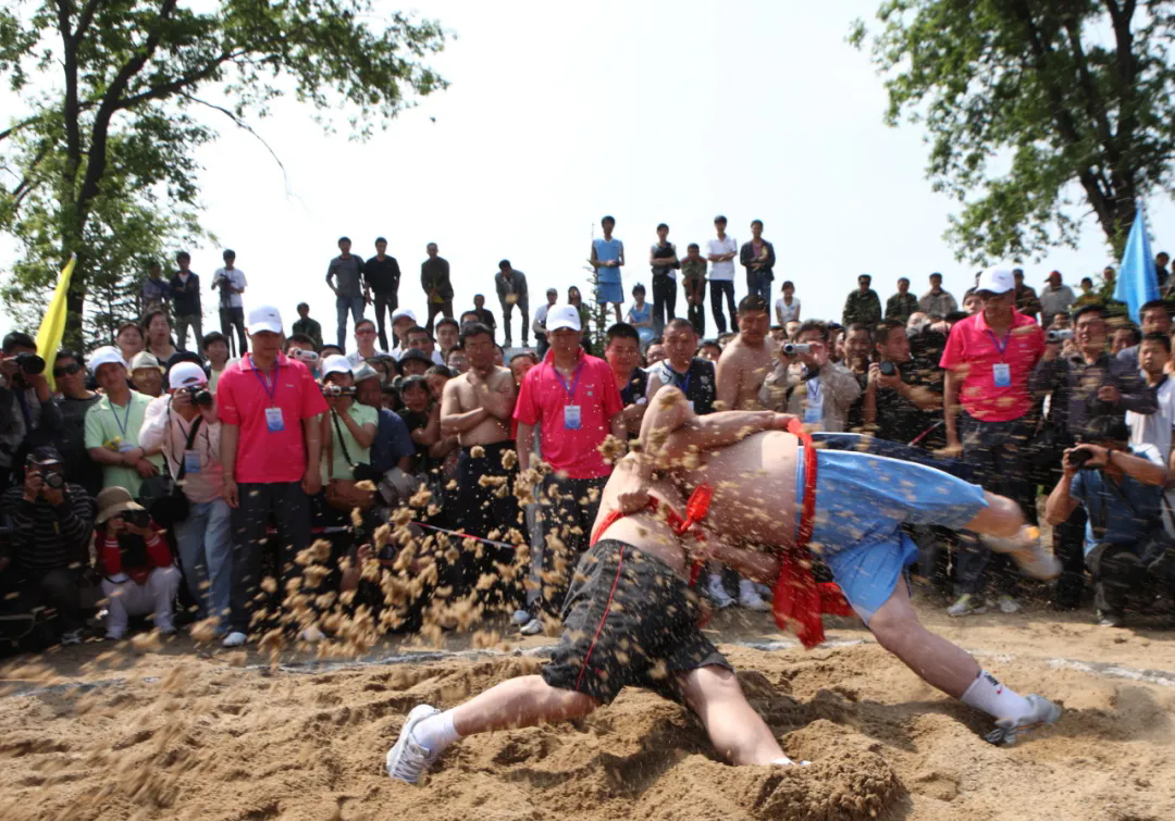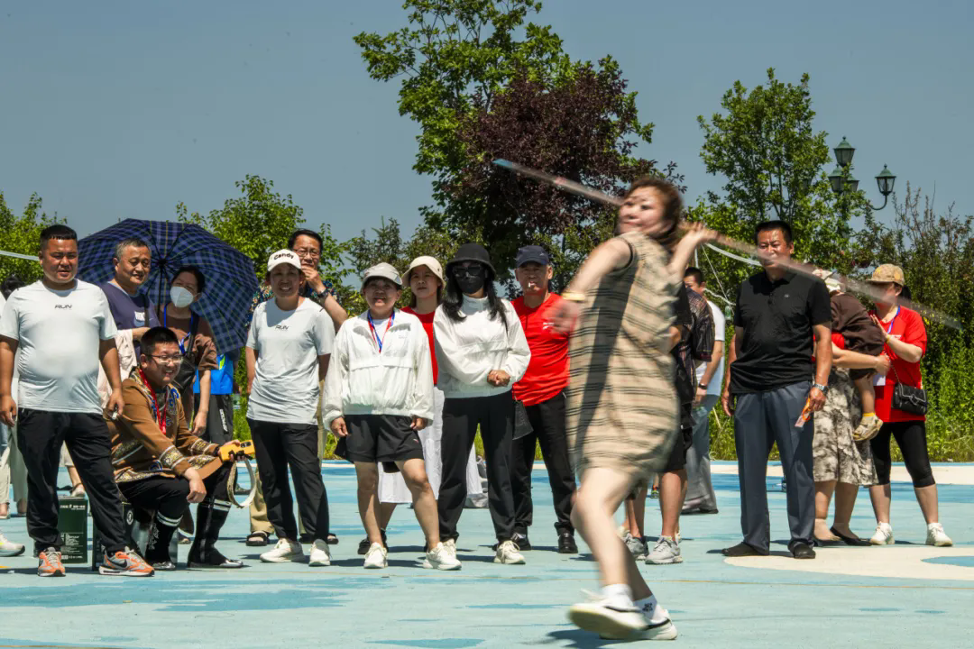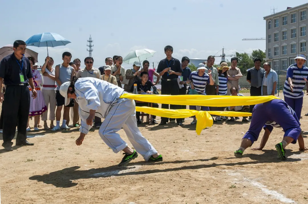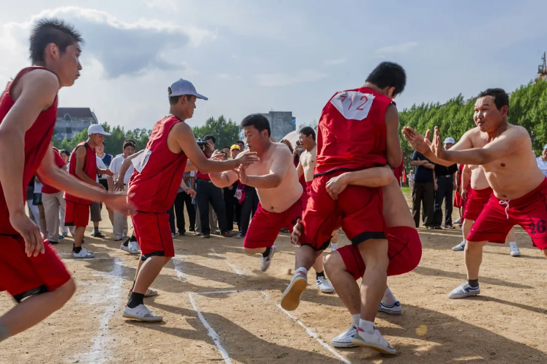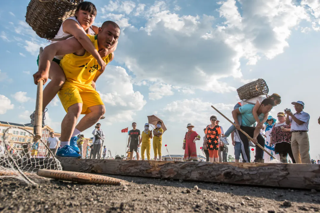 “乌日贡”大会还设置了各式与渔猎生活紧密相连的传统体育竞技项目,包括叉鱼、杜列其、挡木轮、射箭、摔跤、织渔网、扒鱼皮、拉杠和顶杠等多个集体或个人比赛项目,展示赫哲人的勇敢和矫健,呐喊声、助威声此起彼伏,将大会的气氛推向一个又一个高潮。其中,“叉草球”是个极具特色的项目,参赛者手持木叉,奋力将草球投掷起来,再由对方准确地接起,由此考验眼力与臂力,仿佛让人们看到了赫哲族先辈在江河湖泊中叉鱼的精彩瞬间。