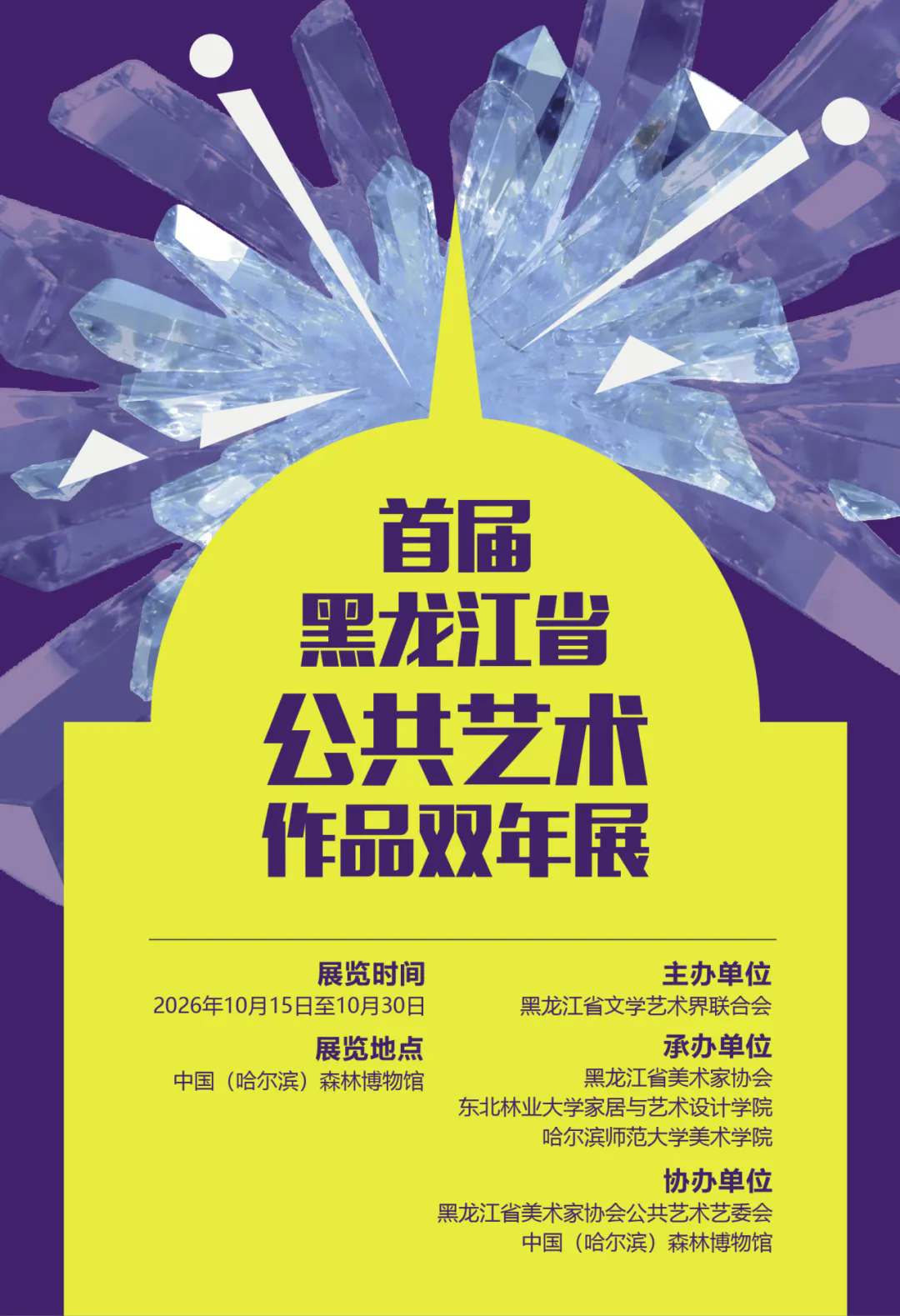 为深入贯彻习近平文化思想,积极探索艺术服务人民、赋能城市的有效路径,黑龙江省美术家协会拟定于2026年10月举办首届黑龙江省公共艺术作品双年展。本次展览以“艺塑龙江·美在人间”为主题,立足黑土地的雄浑气魄与时代新风,倡导创新与跨界融合,推动“政、产、学、研、用”同频共振,力求让艺术之美可观、可感、可参与,真正融入市井巷陌,用公共语言讲述龙江故事,实现艺术赋能城市、美育温润人心的愿景,共同绘就龙江文艺繁荣发展的崭新篇章。现将本次展览的征稿事宜通知如下:
