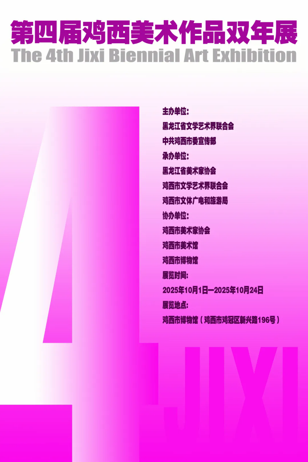 为深入贯彻落实习近平文化思想,发掘培养优秀美术人才,全面展现新时代龙江美术事业高质量发展新气象新成果,黑龙江省文学艺术界联合会、中共鸡西市委宣传部拟举办第四届鸡西美术作品双年展。现将本次展览的征稿事宜通知如下: