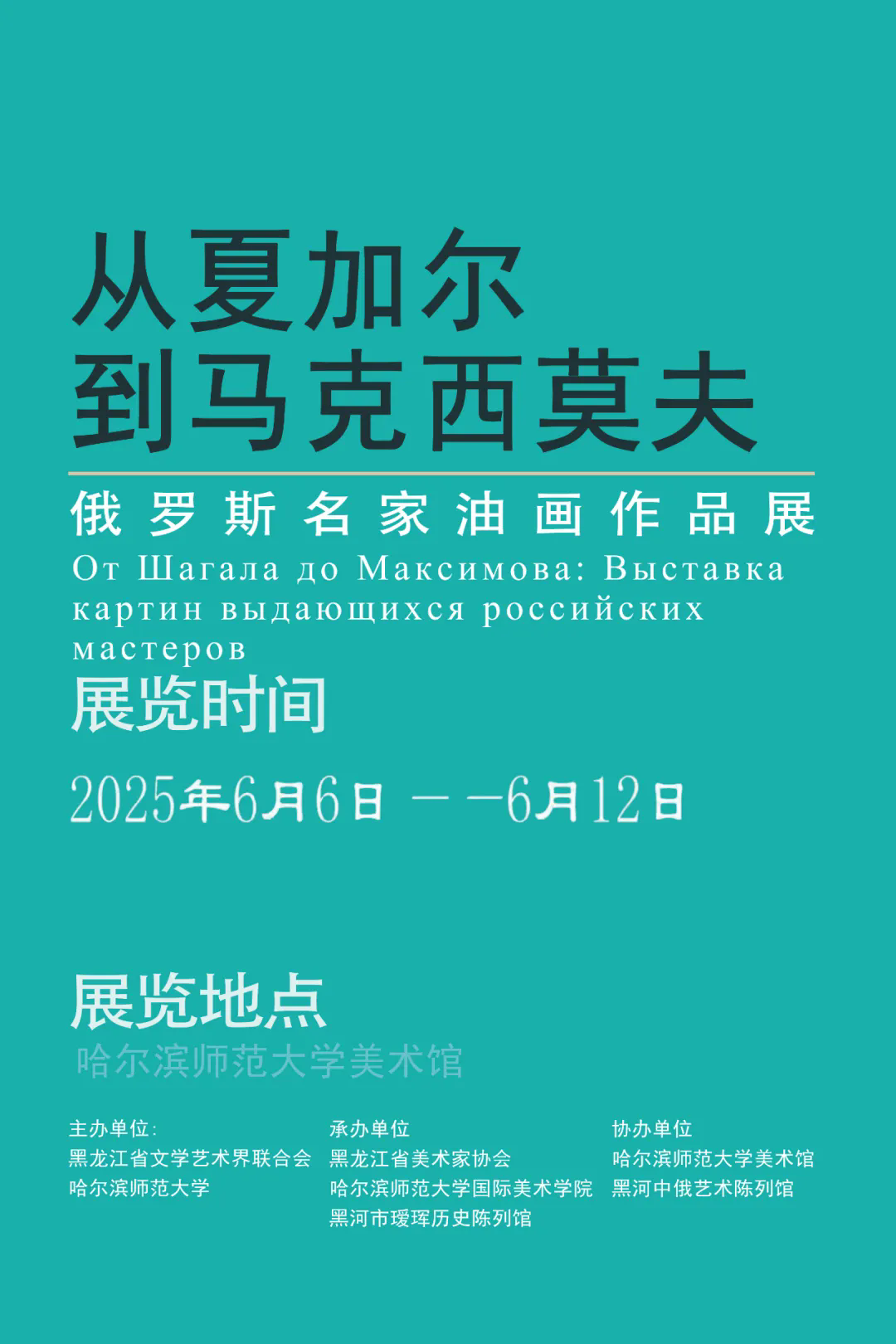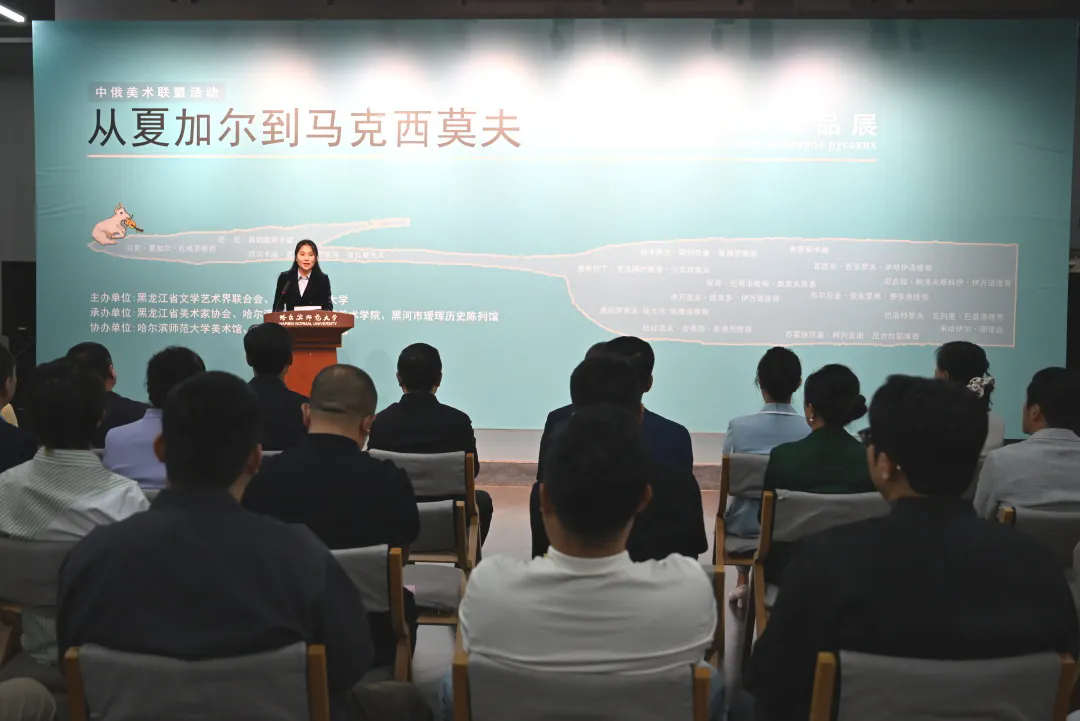 6月6日,由黑龙江省文联、哈尔滨师范大学主办,黑龙江省美协、哈尔滨师范大学国际美术学院、黑河市瑷珲历史陈列馆承办,哈尔滨师范大学美术馆、黑河中俄艺术陈列馆协办的“从夏加尔到马克西莫夫——俄罗斯名家油画作品展”在哈尔滨师范大学美术馆开幕。