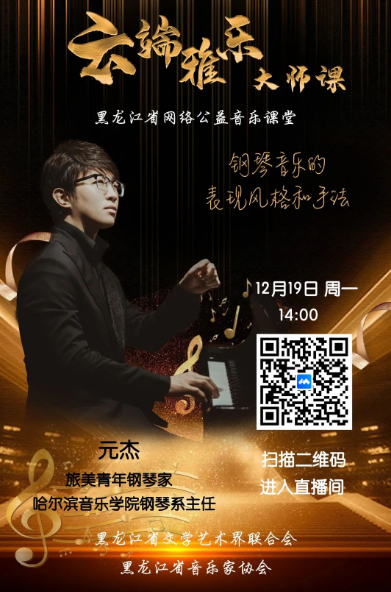 12月19日14:00,文联大讲堂之“云端雅乐”黑龙江省网络公益音乐课堂大师课第22期开讲。黑龙江省文学艺术界联合会、黑龙江省音乐家协会邀请旅美青年钢琴家、哈尔滨音乐学院钢琴系主任元杰,为省音协会员和省内音乐爱好者作题为《钢琴音乐的表现风格和手法》的讲座。请扫描海报上的二维码进入腾讯会议收听收看。