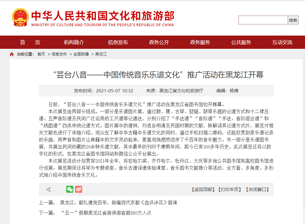 近日,由黑龙江音乐家协会和黑龙江省图书馆共同策划主办,龙江书院承办的“芸台八音——中国传统音乐乐谱展”圆满落下帷幕,线上平台精彩仍在继续。本次展览旨在弘扬中华优秀传统文化,向中国共产党成立100周年献礼,自4月21日开幕以来历时7个月,吸引观众二十多万人次,受到广泛认可和好评。