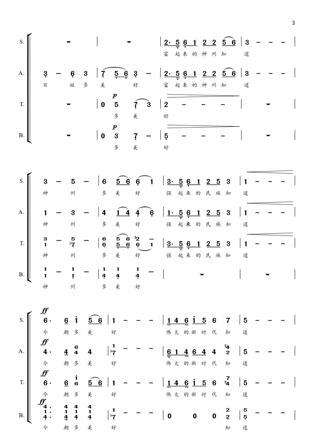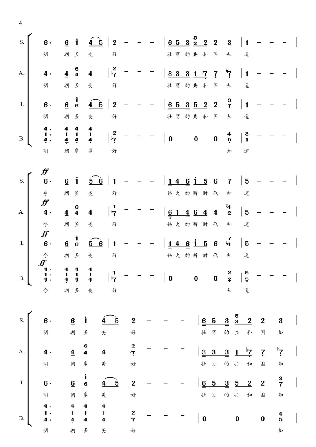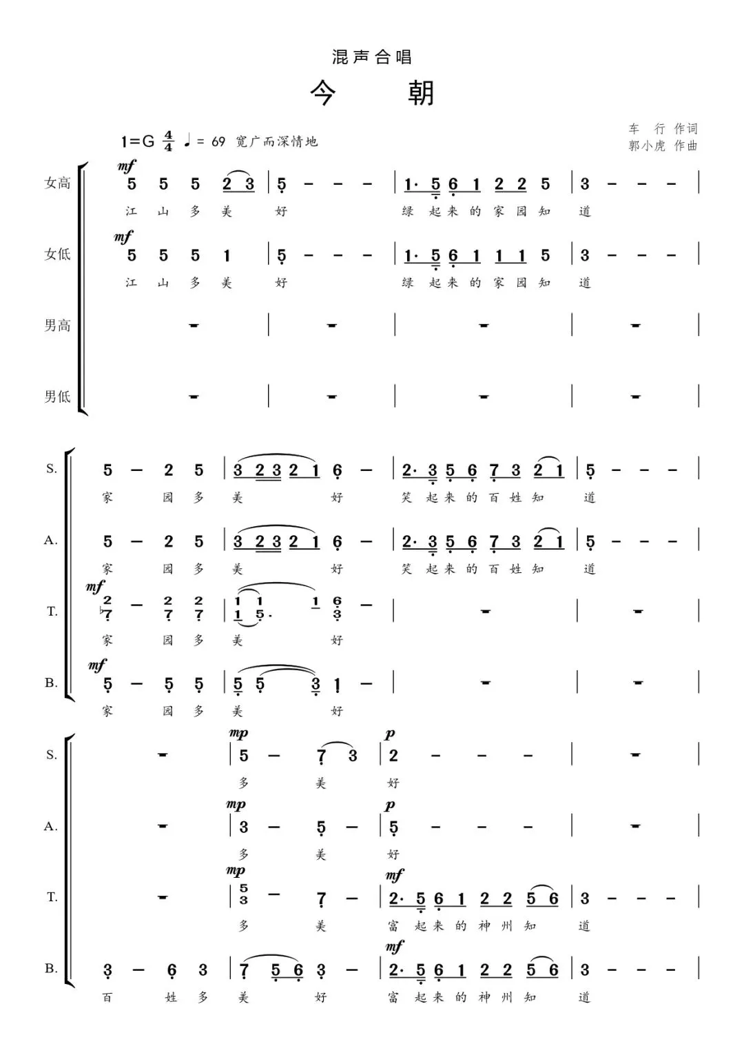 歌词创作主题深刻、寓意深远。《今朝》的歌词篇幅简洁凝练、语言通俗易懂,既具有文学性,又易于传唱。在短短78个字之间,作词家以精湛的笔触描绘出了祖国的繁荣昌盛和人民安居乐业的盛世景象。歌词首先通过由大及小、再由小及大的视角,肯定了“江山”“家园”“百姓”“神州”和“民族”等各个层面今天的美好。同时,词作家又运用顶真修辞的手法,巧妙地将这五种意象串联在了一起,突出强调了他们之间相互依存、互为依托的关系,国泰而民安,民富而国强。“绿起来”“笑起来”“富起来”以借代的修辞手法艺术性地颂扬了我党带领广大人民在建设生态文明、打赢脱贫攻坚战、全面建成小康社会等重大发展战略中所取得的辉煌成就。在歌曲的高潮部分,歌词直抒胸臆,真诚地歌颂了伟大的中国共产党,歌颂了伟大祖国,歌颂了我们美好的新时代。同时,歌词中也饱含着对“今朝”无比真诚的礼赞以及对“明朝”的憧憬与展望。歌词最后以“明朝多美好”作为结尾,展望了未来的壮丽前景,寓意深远,催人奋进。