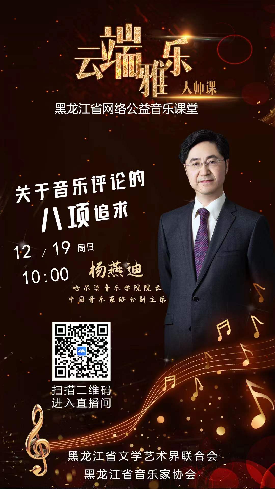 为持续深入开展党史学习教育,将“我为群众办实事”实践活动贯穿党史学习教育全过程,黑龙江省音乐家协会推出“云端雅乐”网络公益音乐课堂系列活动。在12月19日的第17期音乐课堂中,省音协有幸邀请到中国音协副主席、哈尔滨音乐学院院长,音乐学家、音乐评论家、音乐翻译家杨燕迪,专题讲授《关于音乐评论的八项追求》。来自全省13个地市的音协负责人,省音协20个专业委员会会长,音乐爱好者、新文艺群体代表共320人通过腾讯会议在线收听了讲座。
