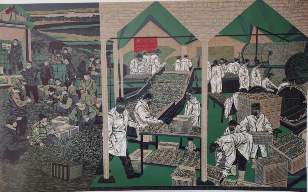 作品《黑土地上的新脱贫——玉米工坊》以套色木刻的方式表现了黑龙江省大庆市杜蒙县一心乡前进村在定点扶贫产业支持下,创收脱贫的劳动场景。作品通过空间解构,将玉米种植、人工去叶、流水清洗、高温消毒、独立包装、物流运输这一系统的工农业生产过程的各个环节进行了全面描绘,生动而又富于视觉震撼。