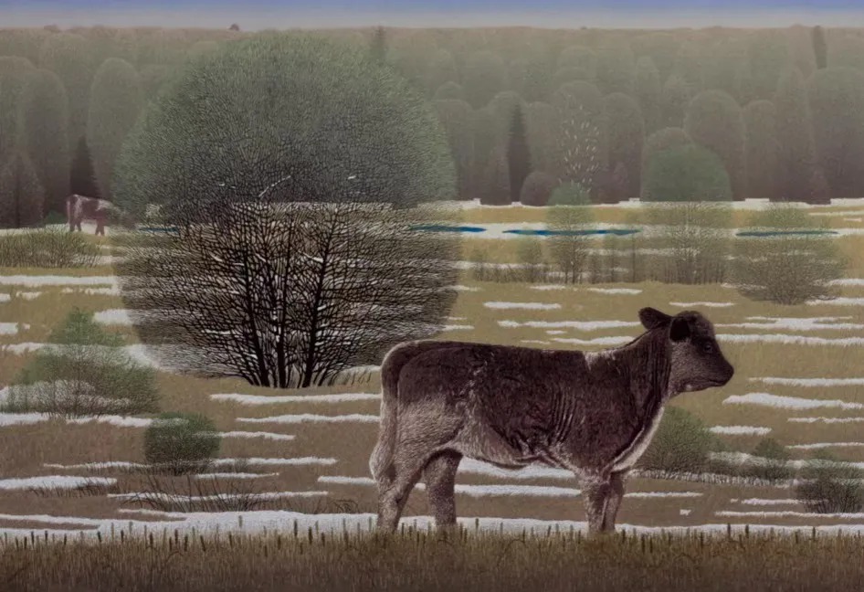 作品《暖风三月》用套色木刻写实的手法表现当下黑土地的田园风光,以此讴歌北方质朴、浑厚、寂寥的自然之美,力求表现出三月暖风袭来树枝初绿的充满生机的北方风情。