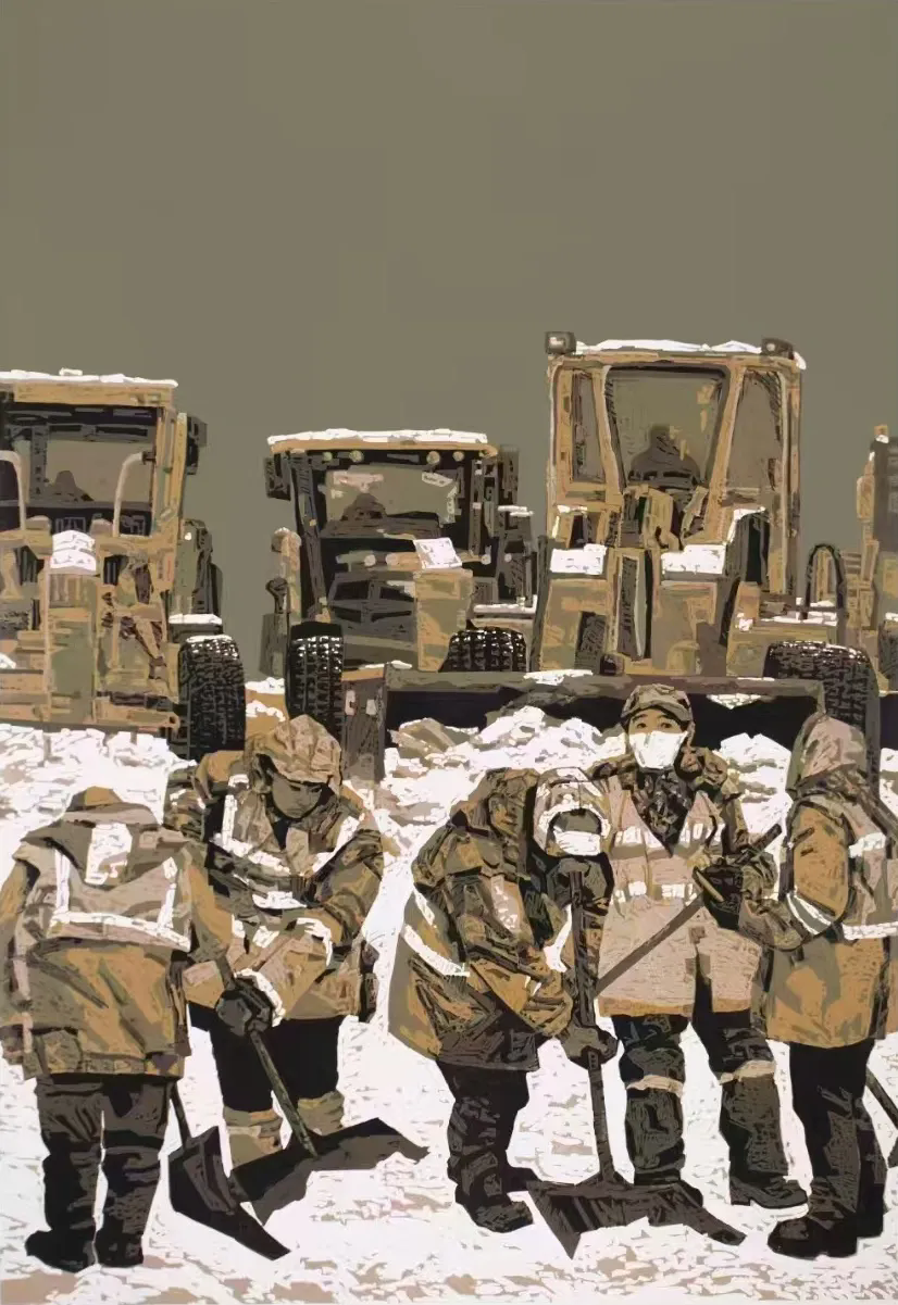 作品《午夜》以雪地作业场景为蓝本,刻画身着工装、戴防护用具的劳动者,配合大型除雪机械,展现出清雪工作现场协作蕴含的力量,作品旨在致敬冬日里守护城市通行的一线工作者。