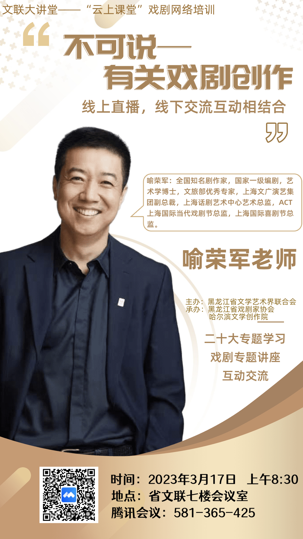 3月17日上午,由黑龙江省文学艺术界联合会主办,黑龙江省戏剧家协会、哈尔滨文学创作院承办的文联大讲堂之“云上课堂”戏剧网络培训活动成功举办。此次网络培训邀请到著名剧作家喻荣军以《“不可说”——有关戏剧创作》为题进行主讲,培训以线上直播与线下互动相结合的方式进行。